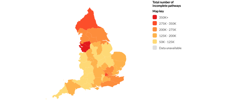 Polimapper’s visualisation shows that, in the Mid and South Essex Integrated Care Board, less than 50% of open pathways were completed within the 18 week target. Click here to launch our waiting times visualisation.