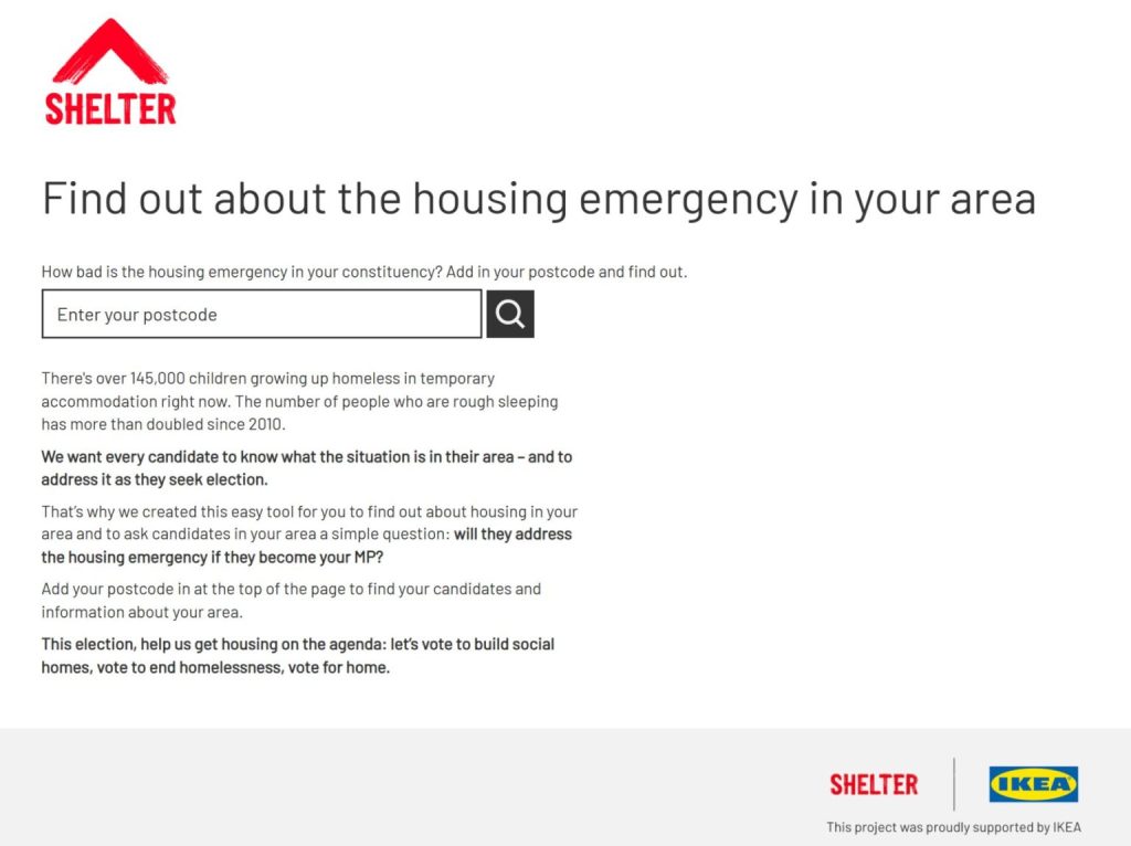 Shelter, in partnership with Ikea, wanted to use Polimapper to paint a picture of levels of homelessness in each constituency in England, and drive supporters towards a candidate email action.