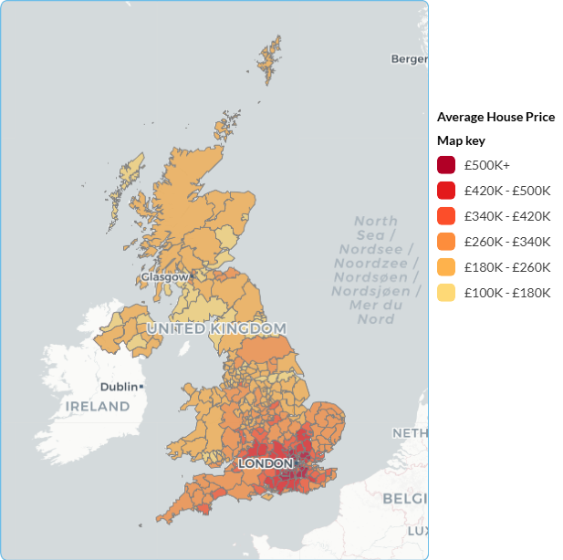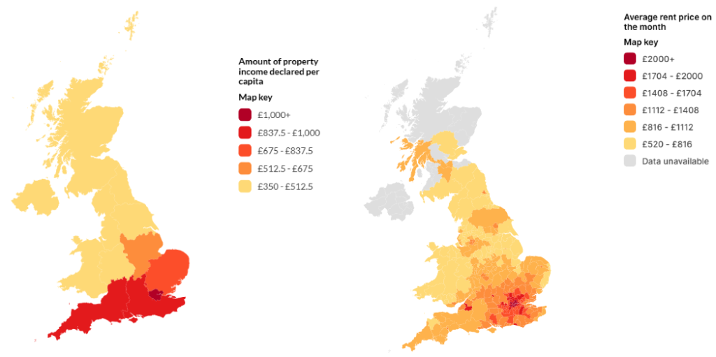 Furthermore, high average rental values, visualised by Polimapper, are concentrated in London, particularly Kensington and Chelsea (£3,629) and Westminster (£3,221). Outside of London, Oxford also registered particularly high average rents (£1,911).