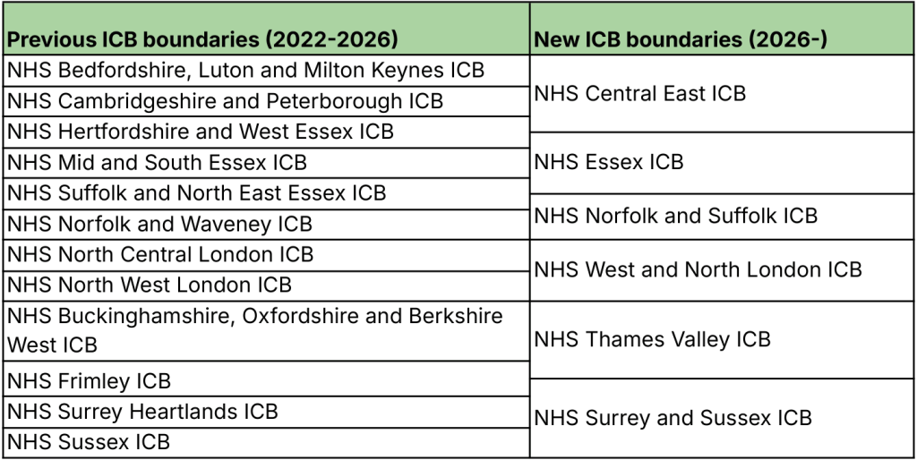 In September 2025, the Minister of State for Health announced a structural overhaul of ICB boundaries through a series of strategic mergers. These changes are now in effect: 12 of the original 42 health boards have been legally dissolved to make way for six new “super-sized” boards. Following these consolidations, the total number of ICBs in England has been reduced from 42 to 36.